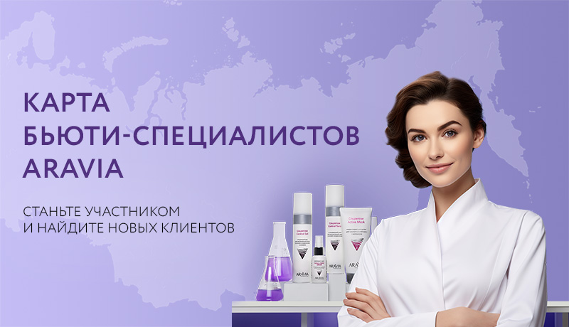 Рады представить вашему вниманию площадку для поиска клиентов и продвижения услуг — Карту бьюти-специалистов ARAVIA. Она поможет мастерам, работающим на косметике ARAVIA, и их клиентам найти друг друга.